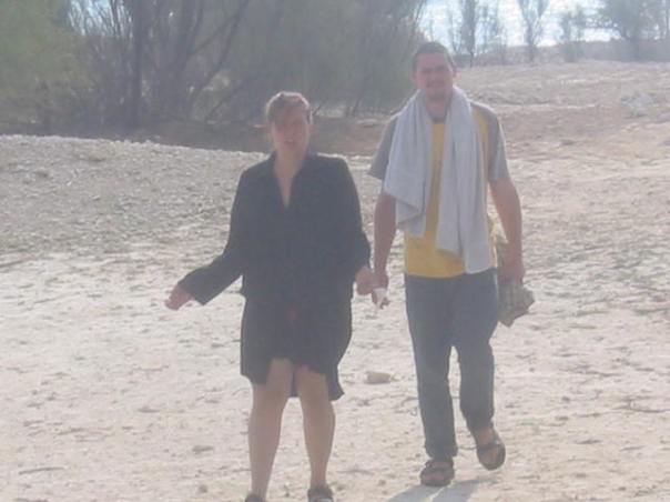 Me and Jim looking for a place to cool off in the Gulf. Not the wisest move to remove my scarf and show my legs, but it was THAT HOT. photo: Eric Baxter